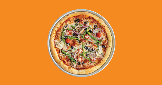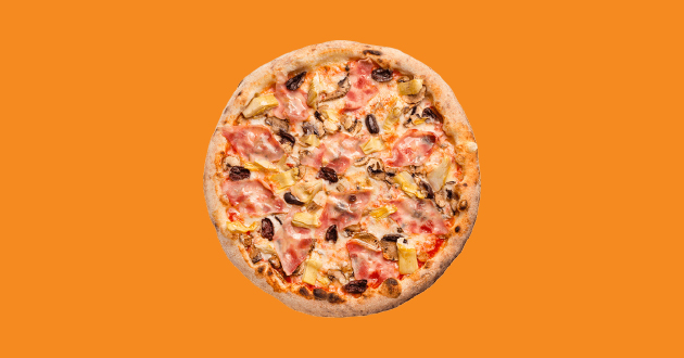 Salcë, mozzarella, proshutë, kerpudha, speca, ullinj(Sauce, mozzarella, ham, mushrooms, peppers, olives)