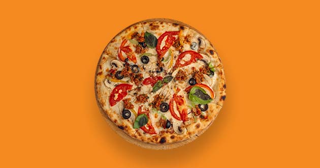Salcë, mozzarella, proshutë, suxhuk, kërpudha, ton, ullinj(Sauce, mozzarella, ham, sausage, mushrooms, tuna, olives)